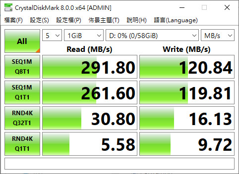 ▲ 內建之SanDisk eMMC 64GB的CrystalDiskMark存取效能測試