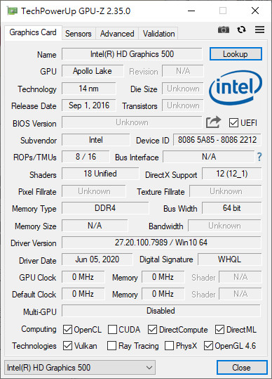 - 顯示卡:Intel HD Graphics 500 (內顯)