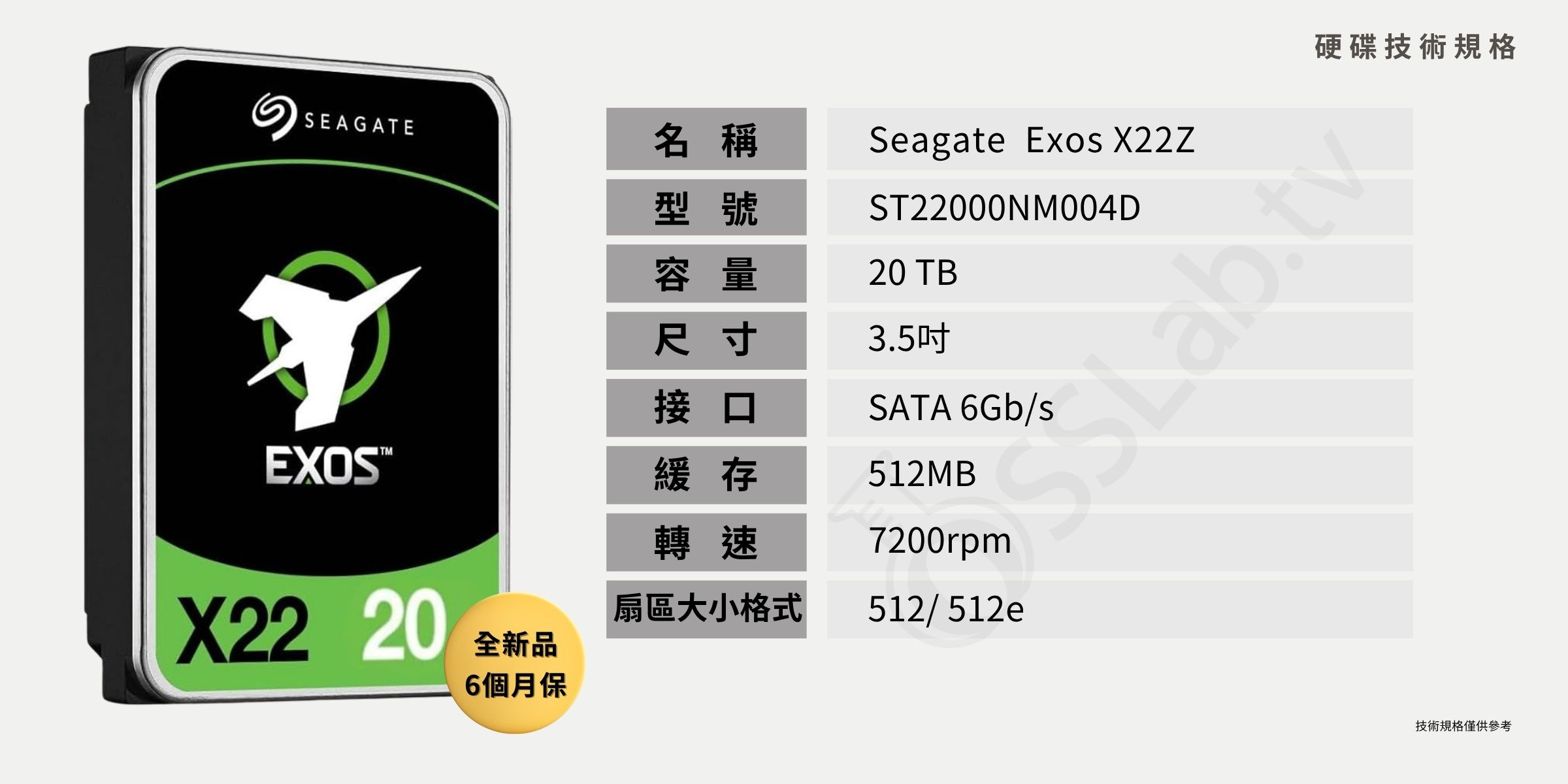型號:ST22000NM004D|容量:20TB|轉速:7200rpm|傳輸介面:SATA|緩衝記憶體:512M